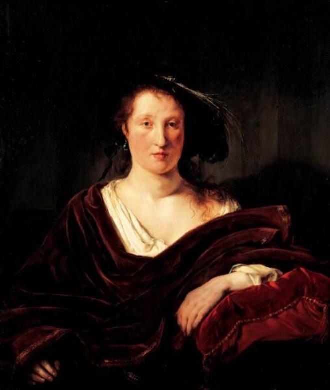 In this painting, Metsu has depicted a life-sized woman seated next to an open window. Leaning on a small table covered with a striped carpet, she stares out into the world as though contemplating an idea she has just taken from the text of the open book before her.2 Her distinctive wardrobe—a voluminous rusty-red cloak, loose-fitting white shirt, and black feathered beret—would have indicated to a seventeenth-century viewer that she was not a contemporary Dutch sitter, but a figure drawn from a different time and place. Metsu’s painting, in fact, calls to mind works by Ferdinand Bol (1616–80) from the early 1650s that depict attractive female figures in “antique” attire, which may best be described as half-length tronies (fig 1).3 An even closer comparison can be made with a painting dated 1652 by the Haarlem artist Salomon de Bray (1597–1664), which is a portrait historié of a woman probably in the guise of Semiramis (fig 2).4 The similarities in costume between the women in Metsu’s and De Bray’s paintings are striking; however, the large book makes it unlikely that Metsu’s sitter also depicts the Assyrian queen.5