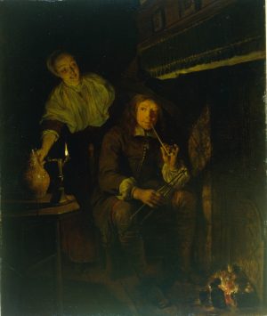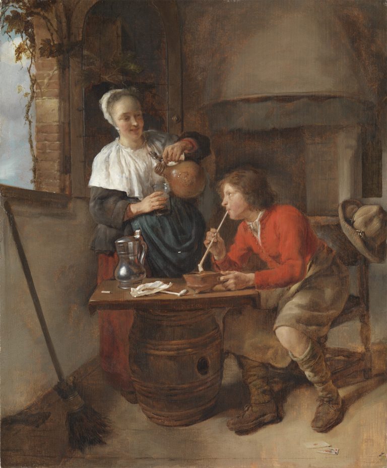 In this painting, Gabriel Metsu seems little concerned with making a moral judgment about the young man’s enjoyment of smoking, and more interested in depicting the gentle rapport between him and the appealing woman serving him his beer. The length of the man’s pipe even hints at his somewhat respectable status. Poor people could afford only unpolished short-stemmed pipes, whereas members of the middle classes used pipes with longer stems that cooled off the smoke and softened the somewhat bitter taste of burnt tobacco.3