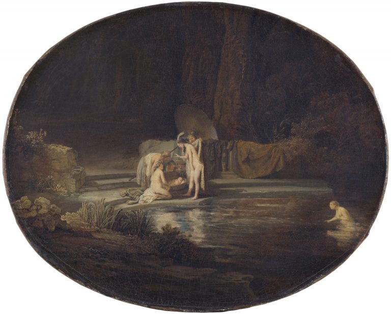 The narrative clarity of Finding of Moses stands in stark contrast to the approach taken by a member of Rembrandt van Rijn’s (1606–69) workshop in a piece executed around this time (fig 2). In this latter painting, the only surviving depiction of the story from Rembrandt’s workshop, nude female bathers peer with great curiosity into Moses’s basket as it floats in the Nile.3 The artist emphasizes the surprise of their discovery through their varied expressions and emphatic gestures. For all of its visual appeal, however, that image lacks the gravitas that characterizes De Grebber’s interpretations of the story, which focus on the solemn moment when the infant is delivered into the arms of Pharoah’s daughter. This act mirrors the ascent of Moses from certain death to his honored position at the Egyptian court.